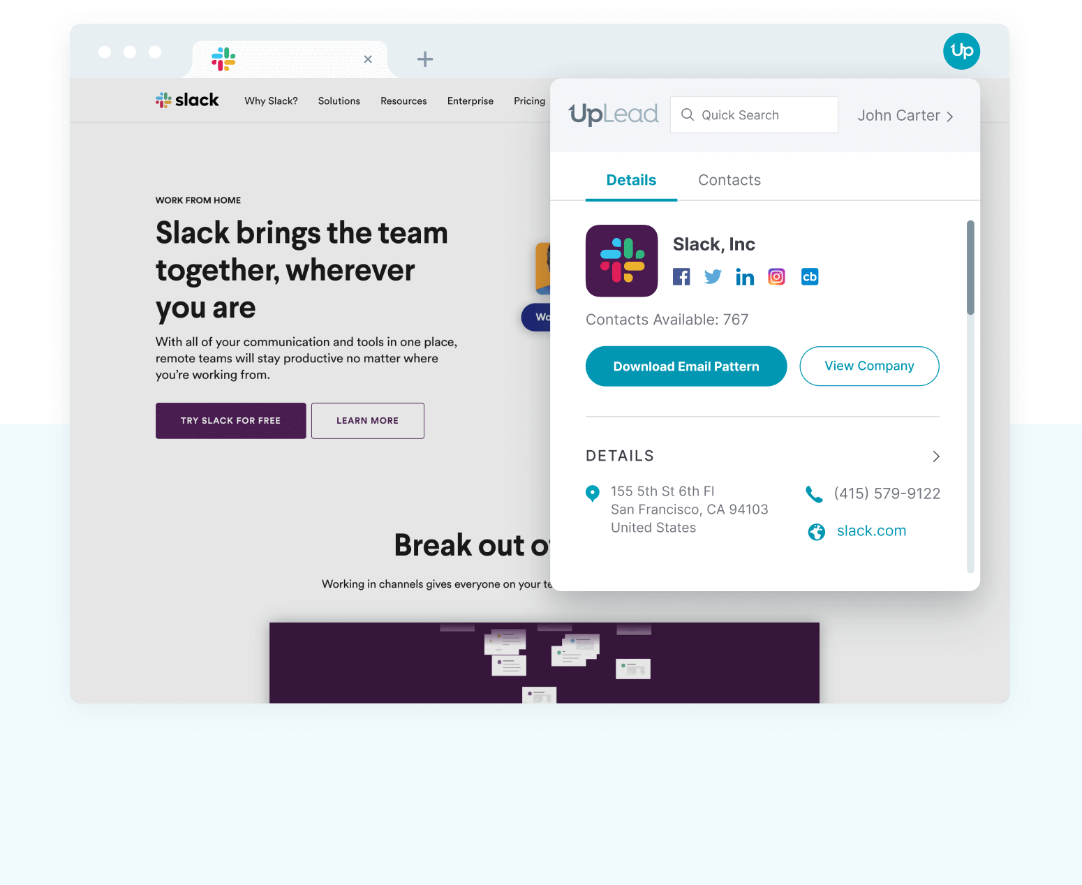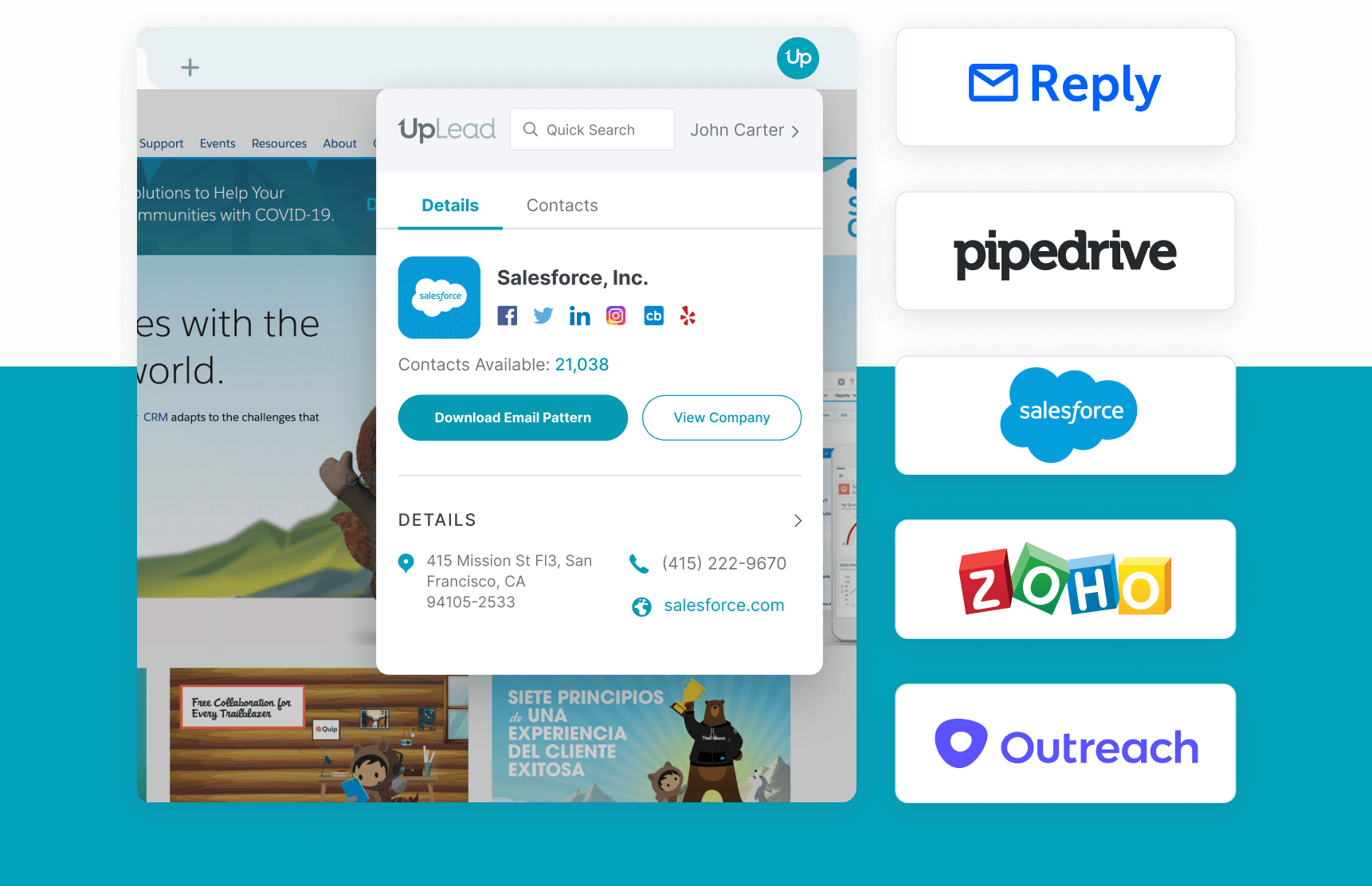 Find leads while browsing the web. Click to push them directly to your CRM or download as a CSV file.