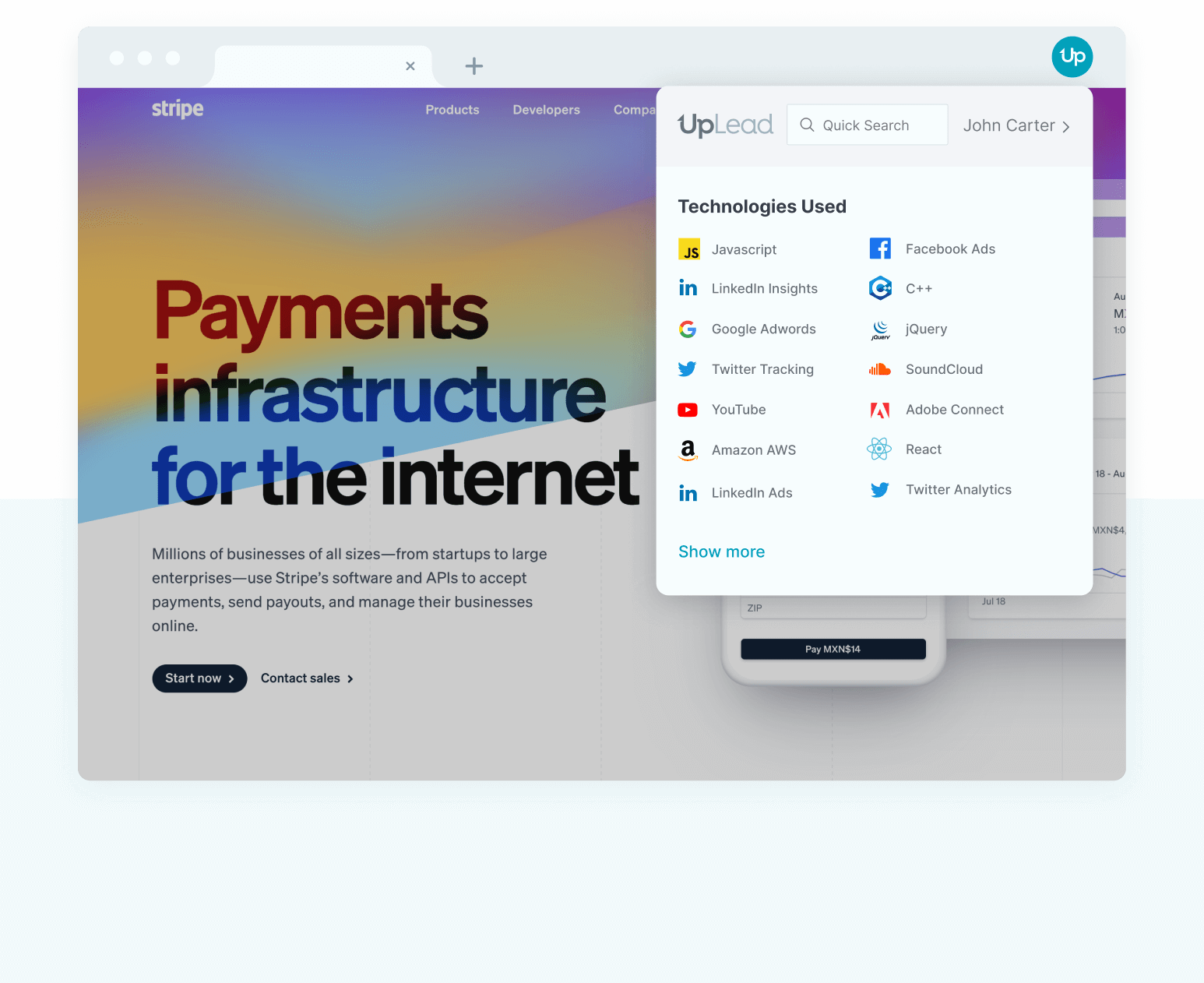 See what tech products your target companies use, by visiting their site. Find everything from coding language to which payment systems they accept.