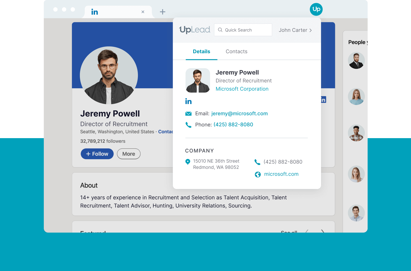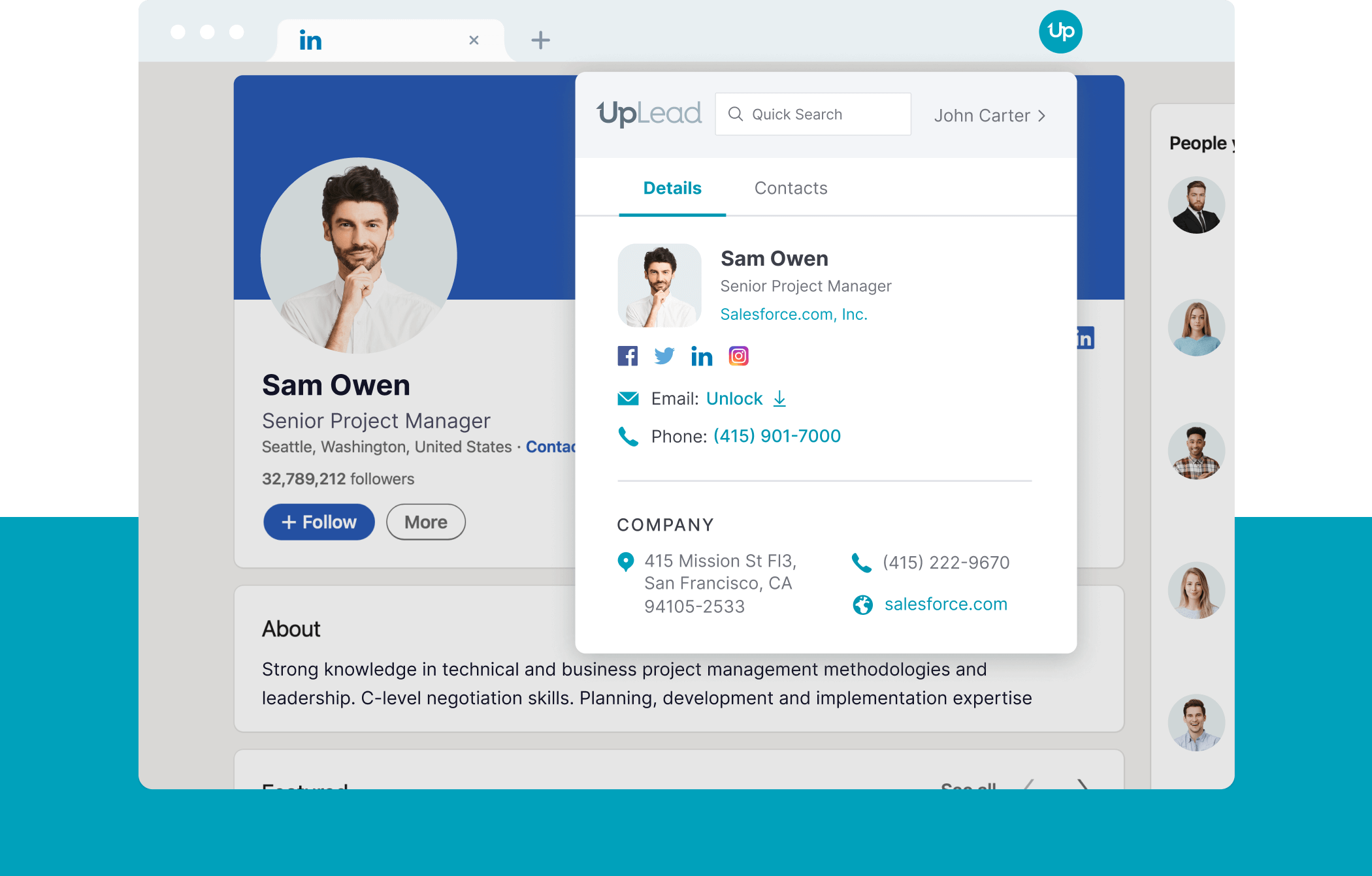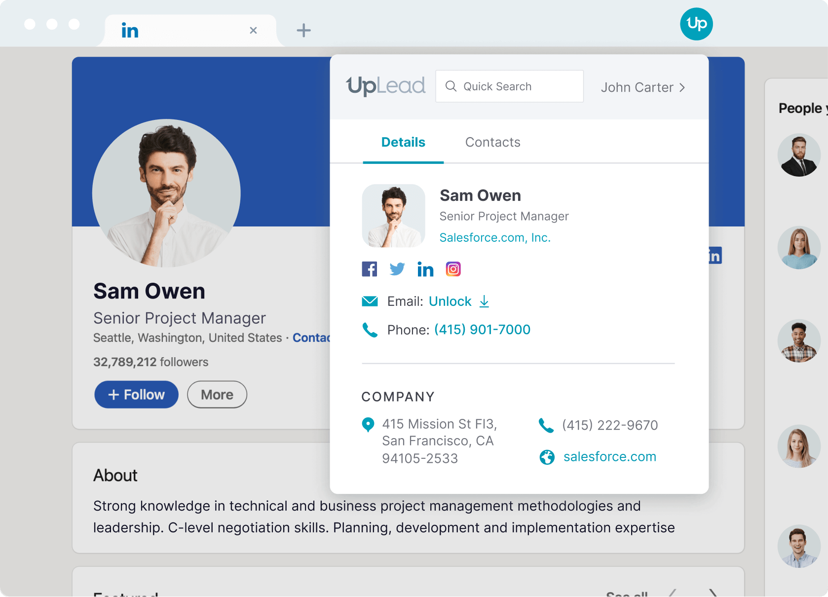 Unlock your prospects’ verified email addresses and phone numbers from LinkedIn. See everything you need to know about them without opening a new tab