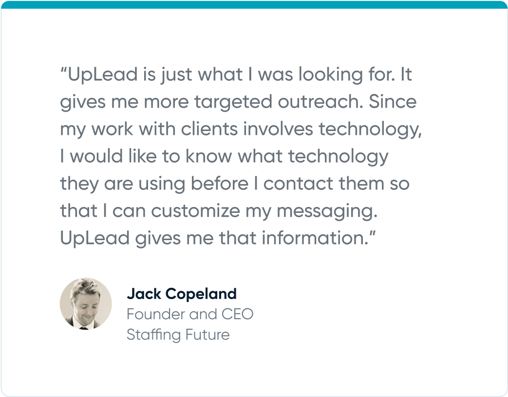 “UpLead is just what I was looking for. It gives me more targeted outreach,” says Jack. “Since my work with clients involves technology, I would like to know what technology they are using before I contact them so that I can customize my messaging. UpLead gives me that information.’’