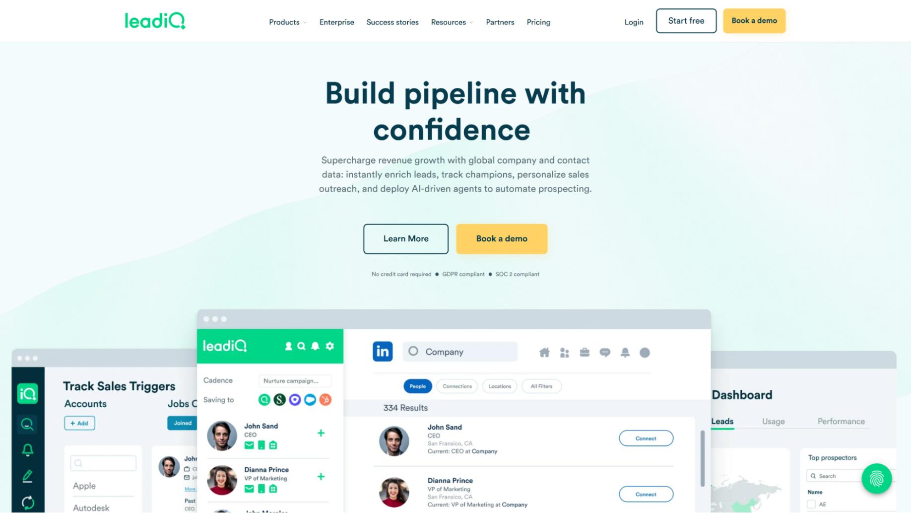 - Compliance: LeadIQ offers widespread compliance and ensures that all of its data and activity comply with leading data privacy regulations. It complies with GDPR, CCPA, SOC 2, and all other U.S. privacy laws.
