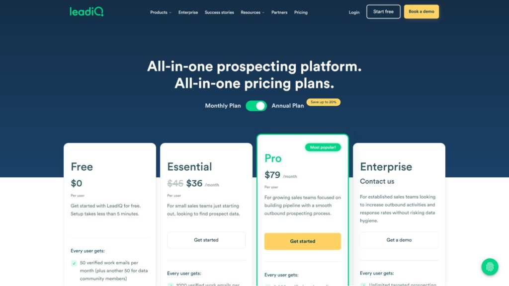 LeadIQ pricing depends on your needs and the plan you choose. In total, the company offers four plans: Free, Essential, Pro, and Enterprise. Here’s a more detailed breakdown of each plan and what it includes: