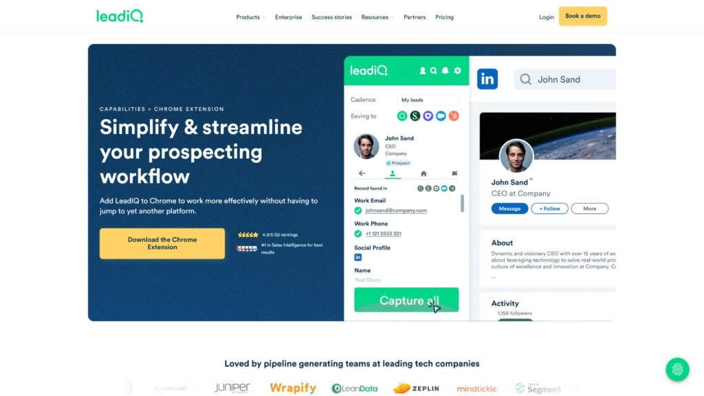LeadIQ is a B2B prospecting platform that helps you identify leads and create personalized messages tailored for each prospect. It helps you build email lists, syncs with various other sales tools, tracks sales triggers, and uses several verification levels to ensure its data is accurate.