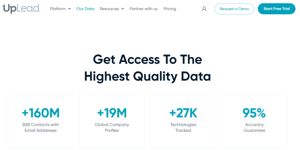 If you require a massive database with over 160 million leads, UpLead is the best choice. Not only is the data comprehensive, but it’s also accurate: UpLead boasts a 95% data accuracy guarantee.