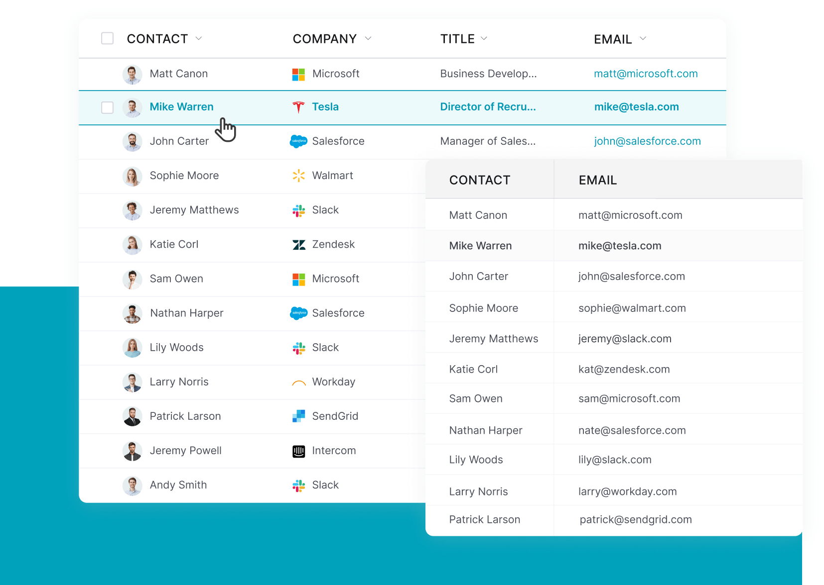 Upload a list of emails and unlock your prospects’ name, title, phone number, social links and more.
